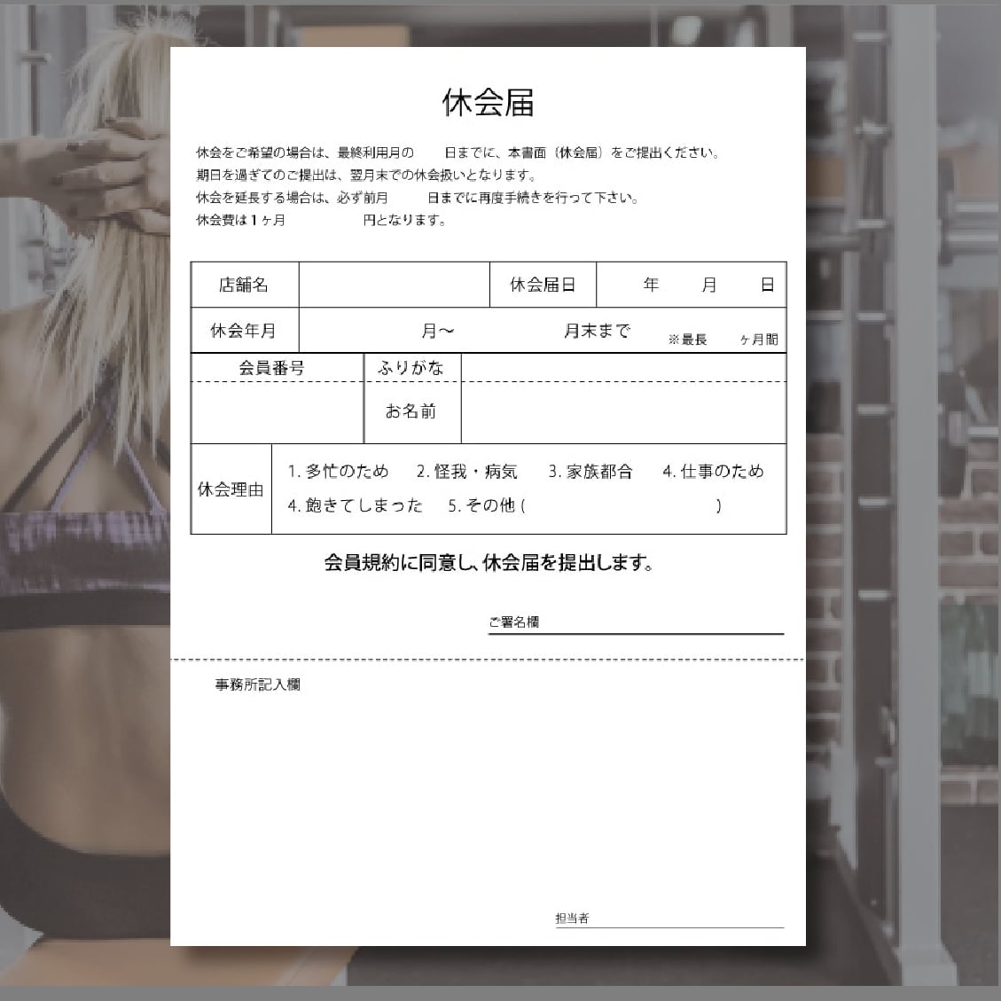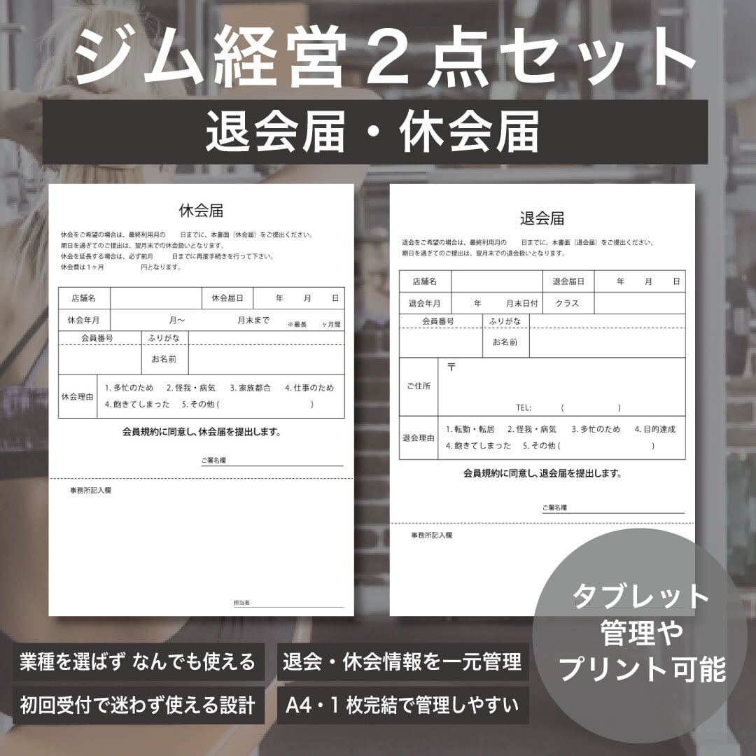 ジムの運営において欠かせない「退会」・「休会」の手続きをスムーズに進めるための書式セットです。現場のニーズを考慮し、使用者にとってシンプルで分かりやすい設計となっています。
